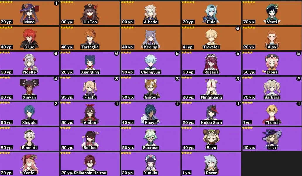 EU- AR:58- C3 DILUC - ALOY - C3 JEAN - C1 HU TAO - VARKA - C1 GANYU - C1 ZHONGLI - C1 KLEE - C1 MONA - C1 TIGHNARI - XILONEN - COLUMBINA - 64 characters