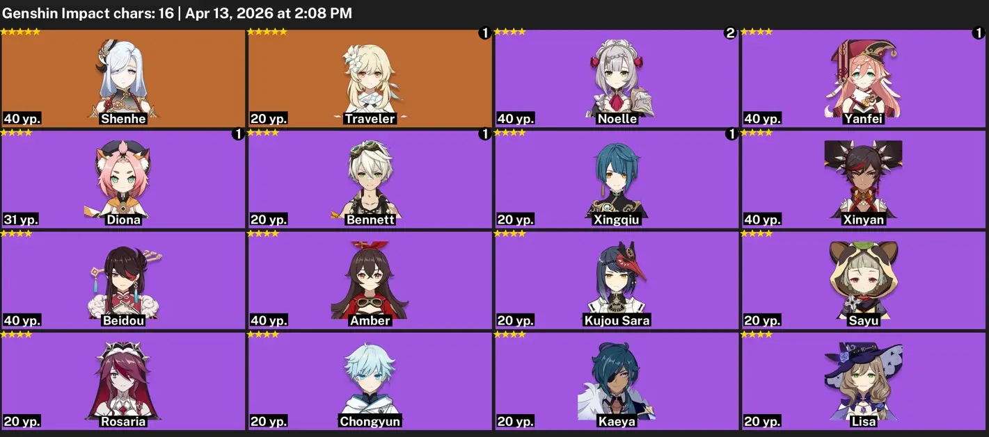 [{"type":"text","content":"-----Genshin Impact\n\nlegendary weapons: 0\nconstellations: 1\nAdventure Experience: 35\nCharacters: 26\nAchievements: 124\nTwisted abyss: -\n\n-----Honkai: Star Rail\n\nlegendary cones: 0\nEidolons: 0\nTrailblaze Level: 10\nCharacters: 8\nAchievements: 11\nVirtual Made Manifest (IV): -"}]