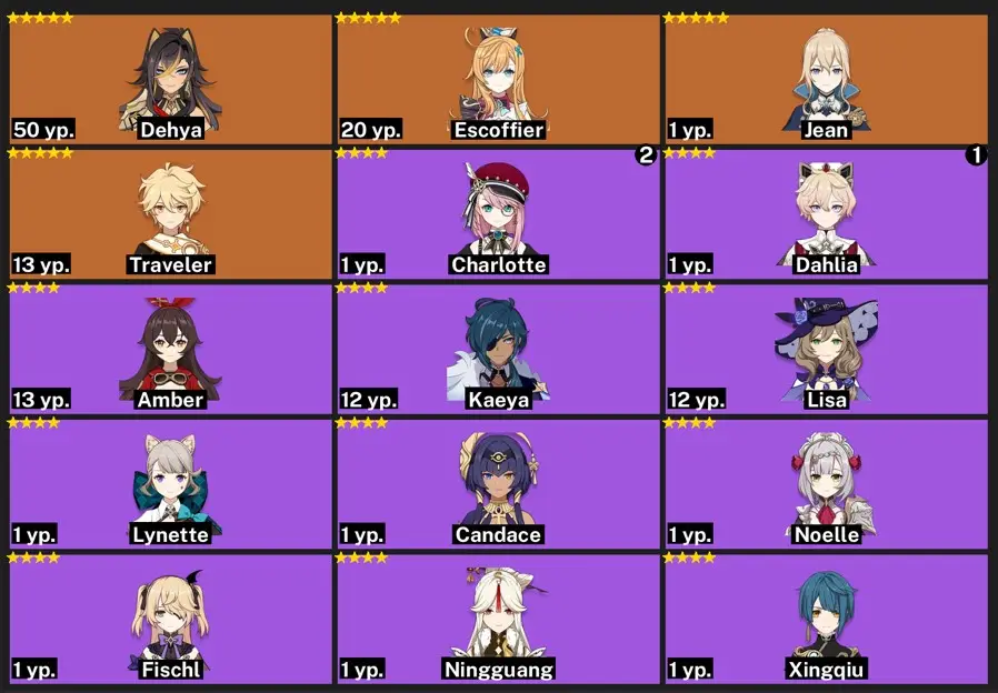 EU- AR:58- C3 DILUC - ALOY - C3 JEAN - C1 HU TAO - VARKA - C1 GANYU - C1 ZHONGLI - C1 KLEE - C1 MONA - C1 TIGHNARI - XILONEN - COLUMBINA - 64 characters
