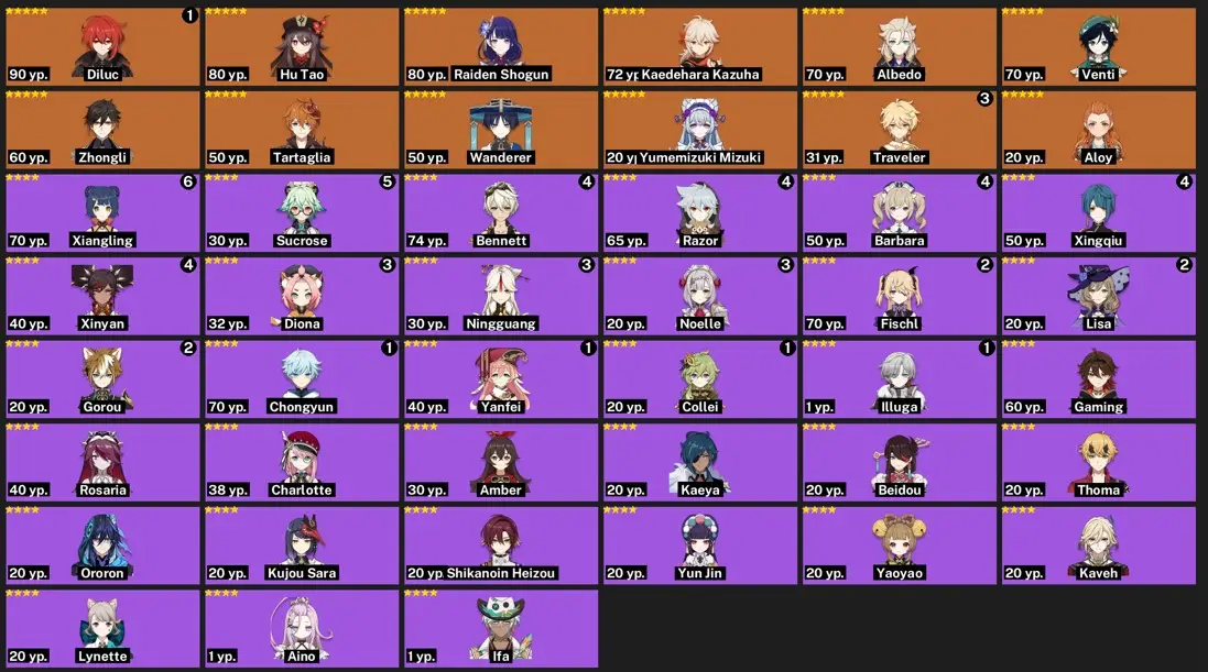 [{"type":"text","content":"---\n\n-----Genshin Impact\n\nlegendary weapons: 0\nconstellations: 0\nAdventure Experience: 55\nCharacters: 35\nAchievements: 389\nTwisted abyss: 8-3\n\nCharacters: \nXIAO\nZHONGLI\nKEQING\nQIQI\nVENTI\nHU TAO\nJEAN\nDILUC\nMONA\n"}]