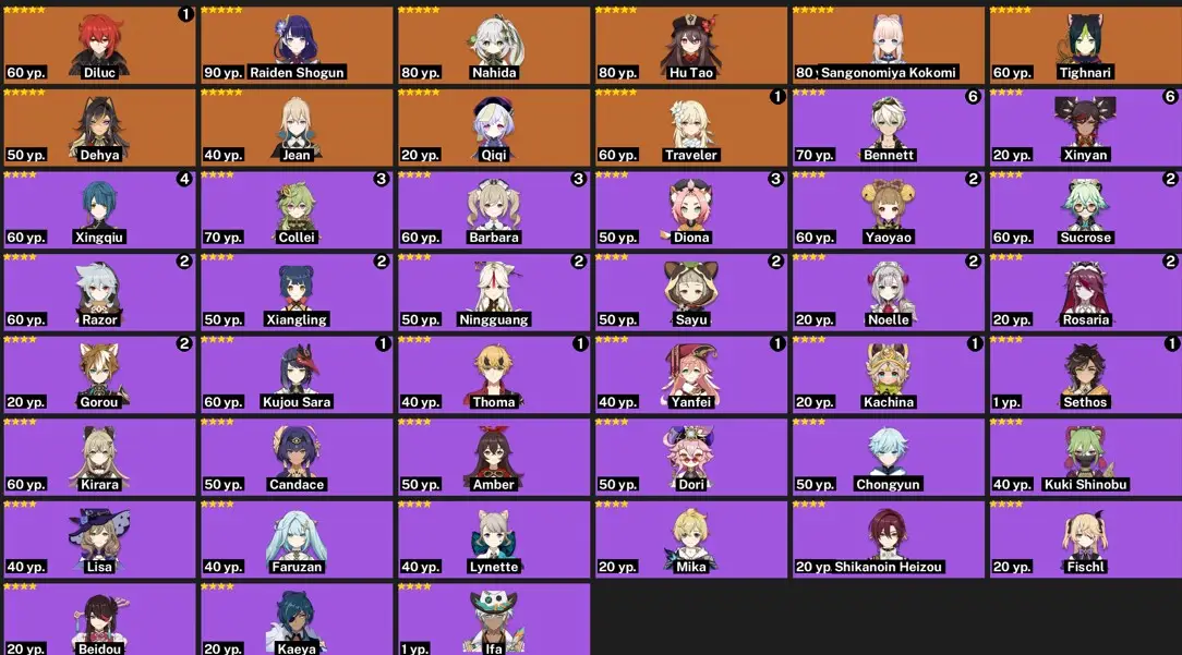 ASIA- AR:56- C1 TARTAGLIA - GANYU - XIAO - KLEE - EULA - ZHONGLI - ALBEDO - KEQING - MONA - VARKA - QIQI - MANEKINA - ALOY - 39 characters