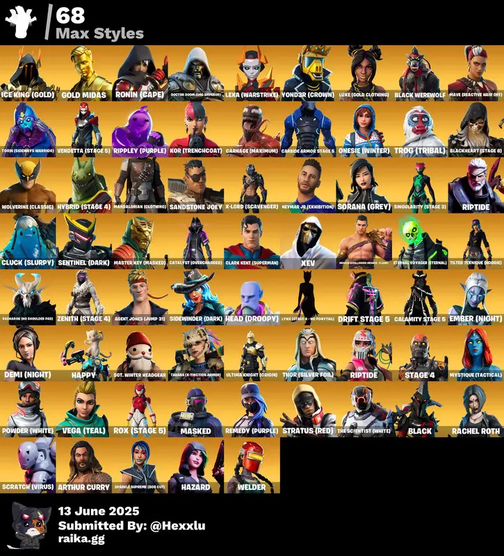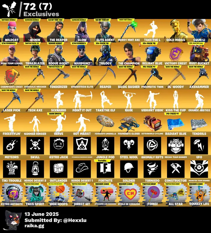 Outfits: 256 Backpacks: 277 Pickaxes: 244 Dances: 217 Gliders: 222 Wraps: 196 Banners: 318 Sprays: 325 Exclusives: 23 FULL ACCESS SAFE NO RECOVERY ACCOUNT