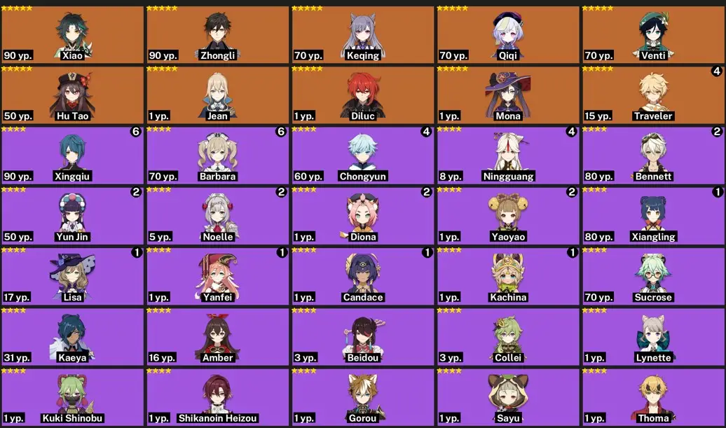 [{"type":"text","content":"-----Genshin Impact\n\nlegendary weapons: 0\nconstellations: 1\nAdventure Experience: 43\nCharacters: 24\nAchievements: 115\nTwisted abyss: -"}]