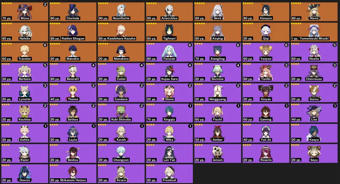 [{"type":"text","content":"---\n\n-----Genshin Impact\n\nlegendary weapons: 0\nconstellations: 0\nAdventure Experience: 40\nCharacters: 16\nAchievements: 86\nTwisted abyss: -\n"}]