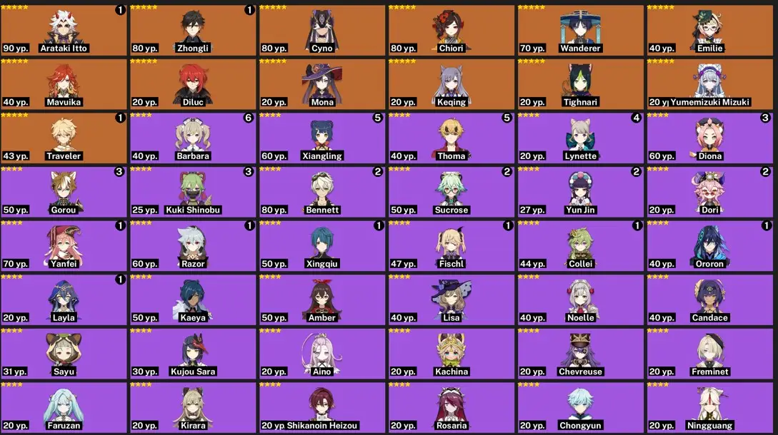 ASIA- AR:55- C1 WANDERER- YELAN- RAIDER SHOGUN-MONA-QIQI15 characters