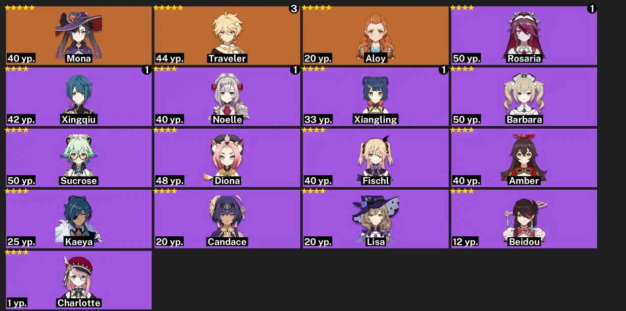 [{"type":"text","content":"-----Genshin Impact\n\nRARE LEGACY character: ALOY\nlegendary weapons: 0\nconstellations: 0\nAdventure Experience: 29\nCharacters: 15\nAchievements: 58\nTwisted abyss: -"}]