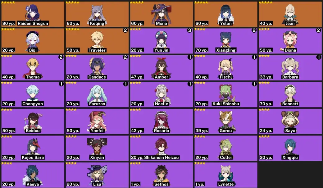 EU - AR:45-RAIDEN SHOGUN - KEQING - MONA - YELAN - JEAN - QIQI -34 characters