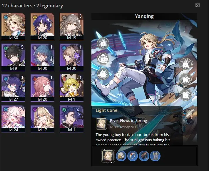 [{"type":"text","content":"-----Genshin Impact\n\nlegendary weapons: 0\nconstellations: 0\nAdventure Experience: 35\nCharacters: 18\nAchievements: 141\nTwisted abyss: -"}]