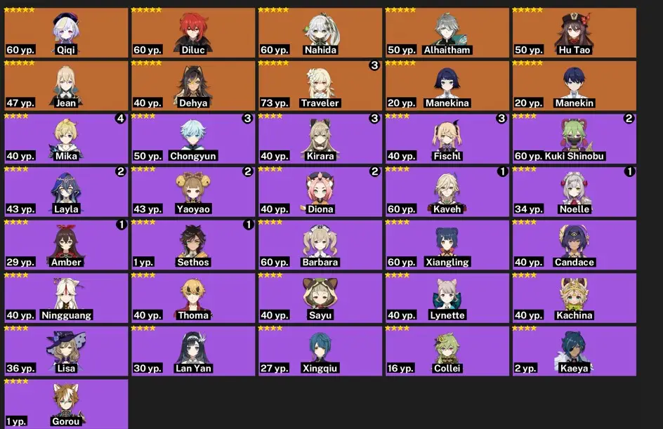 [{"type":"text","content":"---\n\n-----Genshin Impact\n\nlegendary weapons: 0\nconstellations: 0\nAdventure Experience: 25\nCharacters: 16\nAchievements: 33\nTwisted abyss: -\n"}]