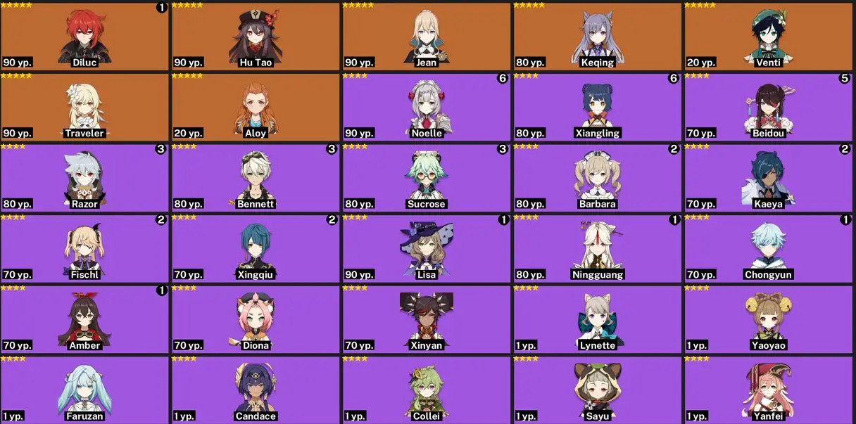 ASIA - AR:45- DILUC - KAMISATO AYAKA - MONA - VENTI - HU TAO - JEAN - ALOY -33 characters
