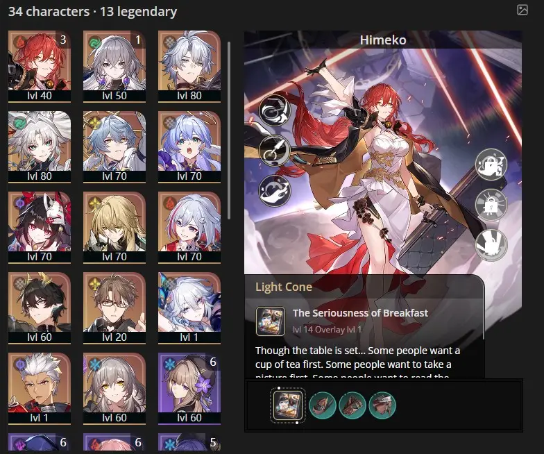 [{"type":"text","content":"-----Genshin Impact\n\nlegendary weapons: 0\nconstellations: 1\nAdventure Experience: 35\nCharacters: 26\nAchievements: 124\nTwisted abyss: -\n\n-----Honkai: Star Rail\n\nlegendary cones: 0\nEidolons: 0\nTrailblaze Level: 10\nCharacters: 8\nAchievements: 11\nVirtual Made Manifest (IV): -"}]