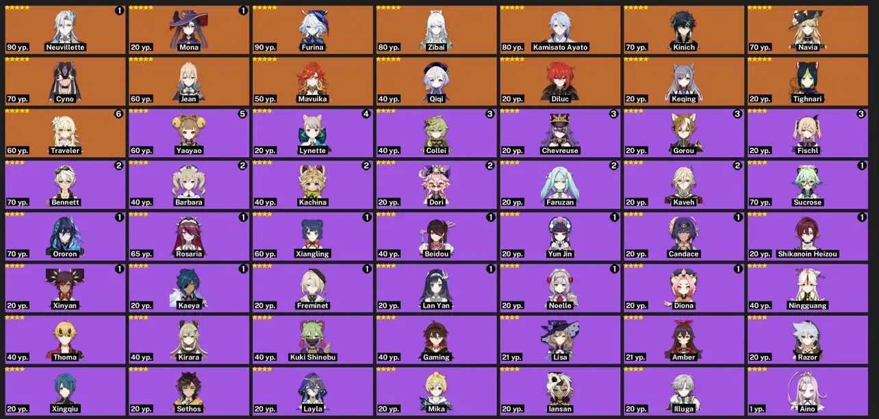 EU- AR:55- C1 NEUVILLETTE -C1 MONA - FURINA - ZIBAI - KAMISATO AYATO - KINICH - NAVIA - CYNO - JEAN - MAVUIKA - QIQI - DILUC - 56 characters
