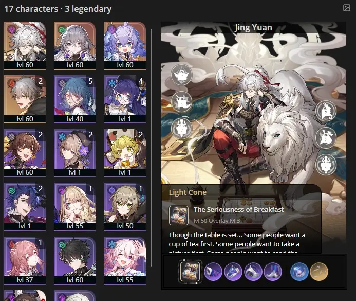 [{"type":"text","content":"---\n\n-----Genshin Impact\n\nlegendary weapons: 0\nconstellations: 2\nAdventure Experience: 50\nCharacters: 35\nAchievements: 283\nTwisted abyss: -\n\nCharacters: \nC1 DILUC\nC1 MONA\nXIAO\nHU TAO\nSANGONOMIYA KOKOMI\nYAE MIKO\nALOY\n\n-----Honkai: Star Rail\n\nlegendary cones: 0\nEidolons: 0\nTrailblaze Level: 22\nCharacters: 14\nAchievements: 45\nVirtual Made Manifest (IV): -\n\n-----Zenless Zone Zero\n\nlegendary weapons: 0\nMindscape Cinemas: 0\nInter-Knot Level: 17\nCharacters: 9\nAchievements: 24\n"}]
