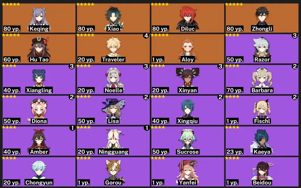 ASIAV- AR:48- KEQING - XIAO - DILUC - ZHONGLI - HU TAO - ALOY -24 characters