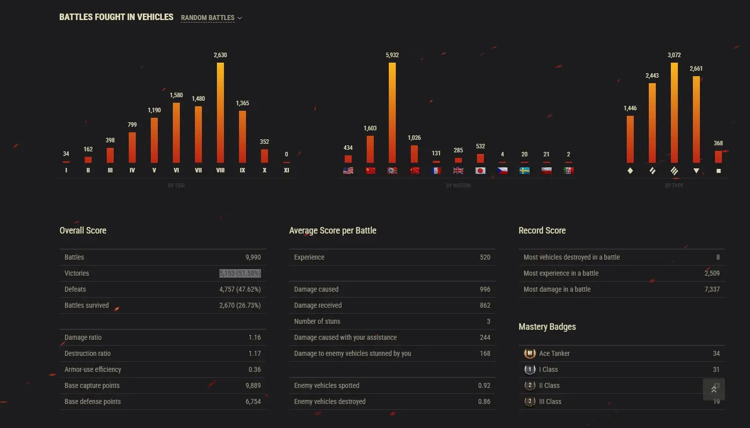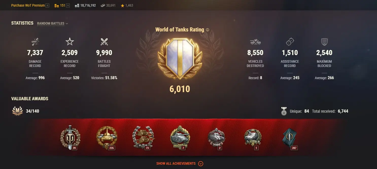 5 TOP TANKS | 9 PREMIUM TANKS | 151 GOLD | 9,990 BATTLES | INACTIVE