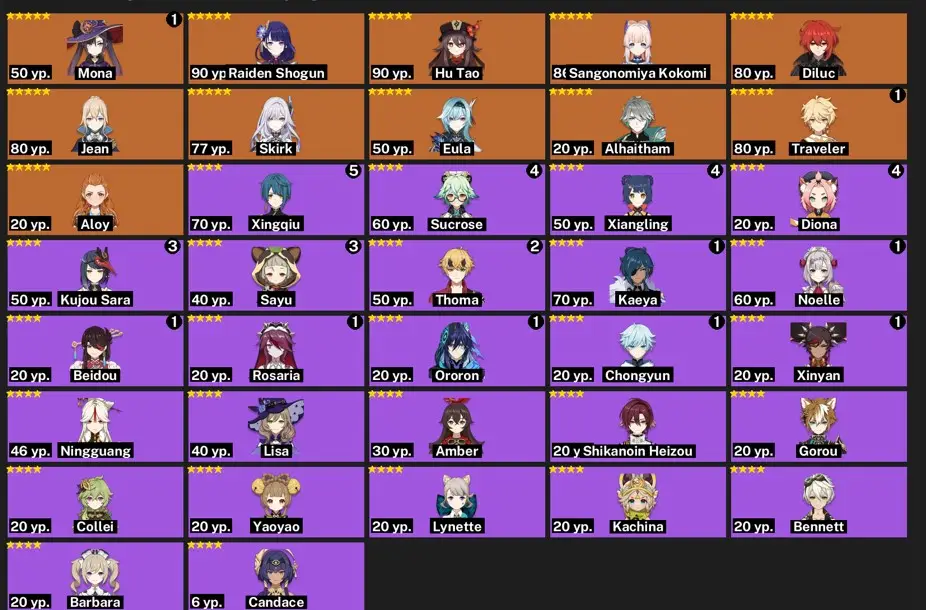 ASIA- AR:50- C1 MONA - C1 TIGHNARI - KLEE - SKIRK - RAIDEN SHOGUN - KEQING - KAMISATO AYATO - DILUC - 37 characters