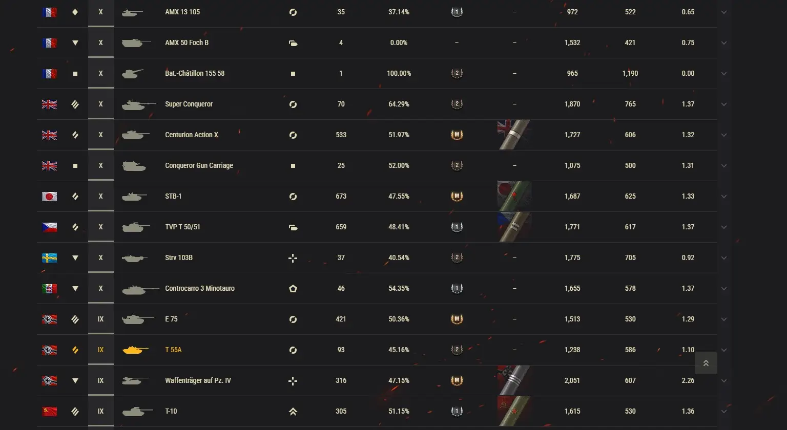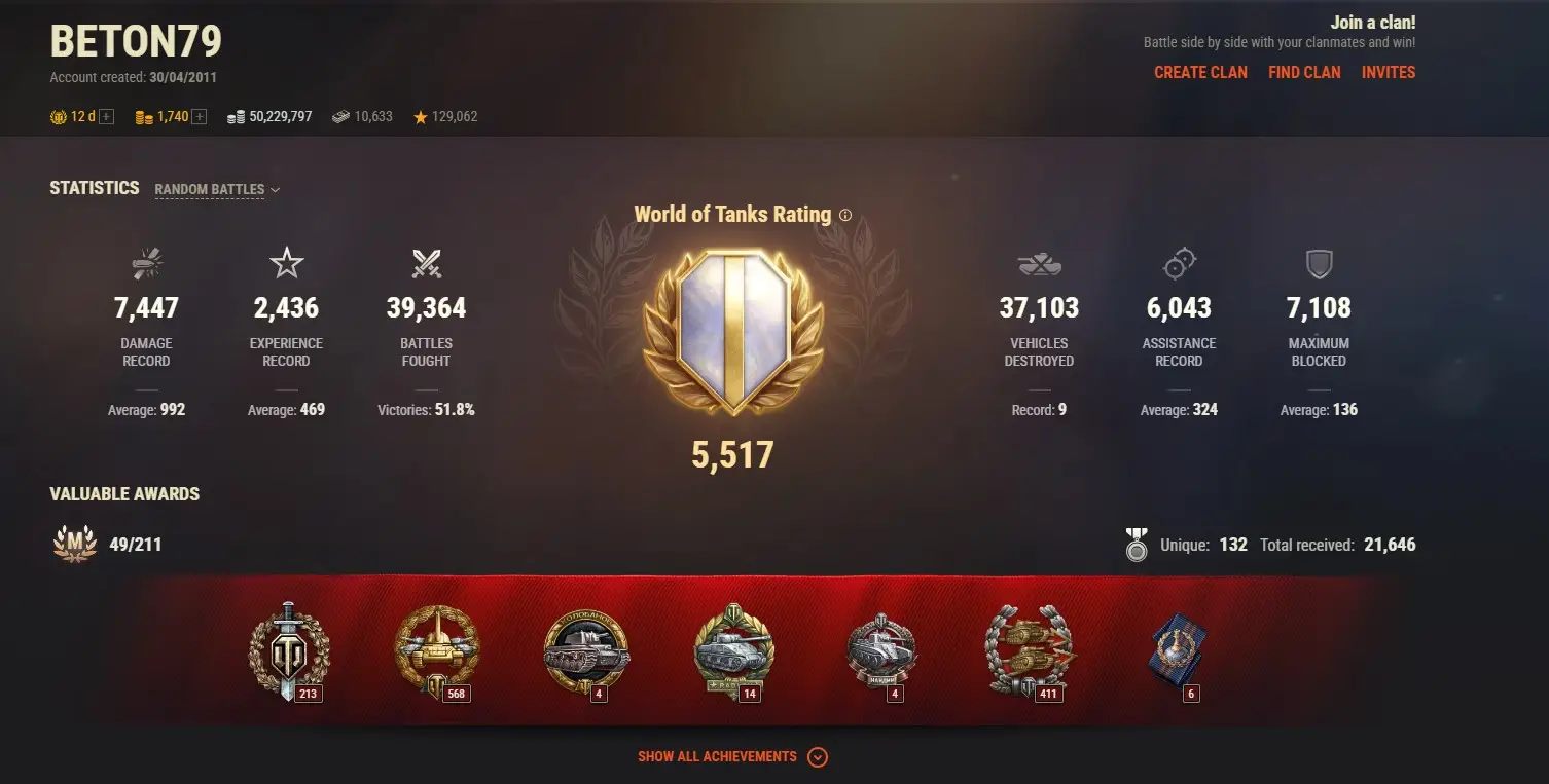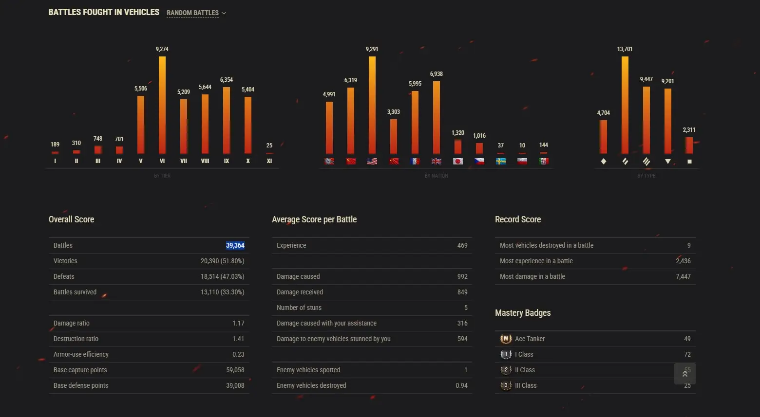 19 TOP TANKS | 15 PREMIUM TANKS | 1,740 GOLD | 39,364 BATTLES | INACTIVE