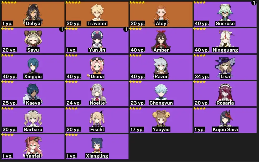 EU- AR:55- C1 NEUVILLETTE -C1 MONA - FURINA - ZIBAI - KAMISATO AYATO - KINICH - NAVIA - CYNO - JEAN - MAVUIKA - QIQI - DILUC - 56 characters