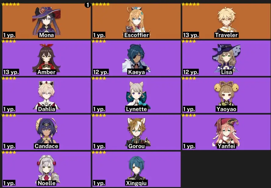 [{"type":"text","content":"-----Genshin Impact\n\nlegendary weapons: 5\nconstellations: 4\nAdventure Experience: 57\nCharacters: 58\nAchievements: 632\nTwisted abyss: 11-3\n\nCharacters:\nXILONEN\nRAIDEN SHOGUN\nNAHIDA\nSKIRK\nESCOFFIER\nLAUMA\nMAVUIKA\nCHIORI\nC1 DEHYA\nMONA\nC3 JEAN\nDILUC\nTIGHNARI"}]