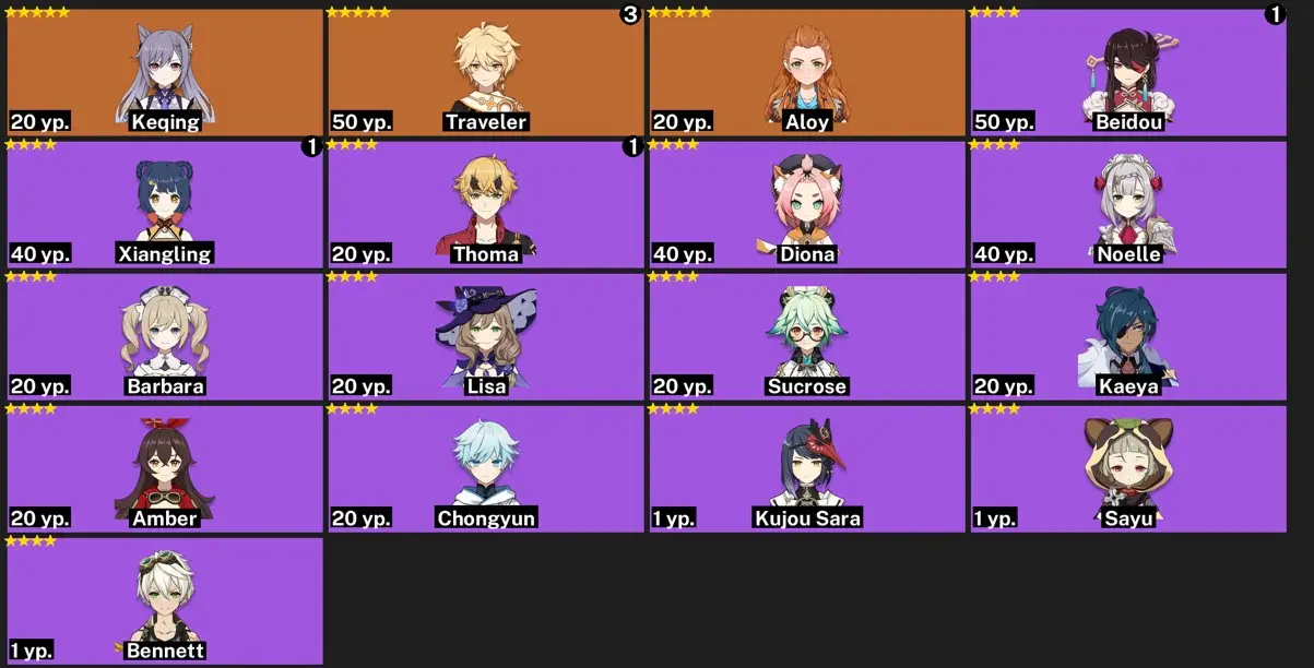 [{"type":"text","content":"-----Genshin Impact\n\nRARE LEGACY character: ALOY\nlegendary weapons: 0\nconstellations: 0\nAdventure Experience: 32\nCharacters: 17\nAchievements: 101\nTwisted abyss: -"}]
