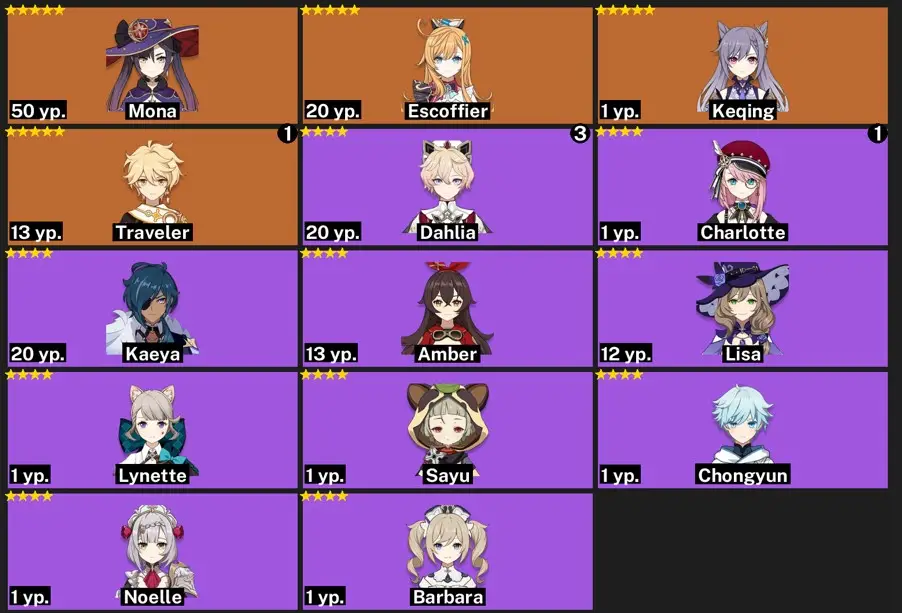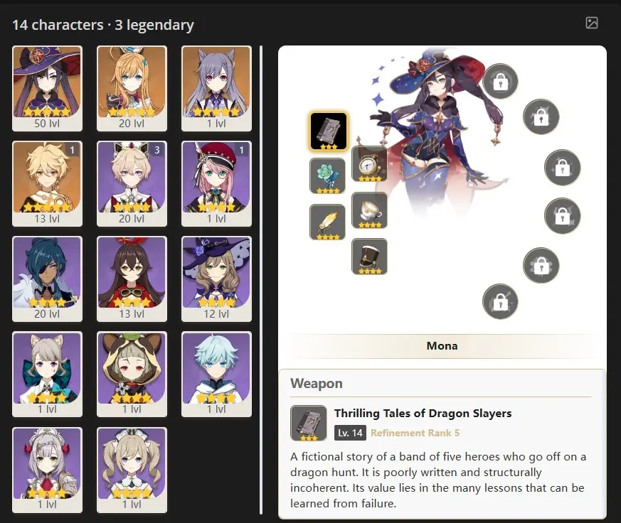 [{"type":"text","content":"-----Genshin Impact\n\nlegendary weapons: 0\nconstellations: 0\nAdventure Experience: 40\nCharacters: 20\nAchievements: 71\nTwisted abyss: 5-1"}]